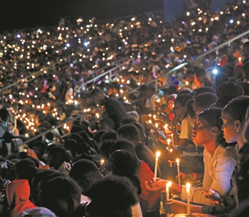 压题照片为2019年4月7日,在卢旺达首都基加利,民众参加纪念卢旺达大屠杀25周年守夜活动。