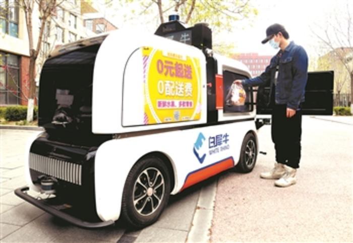 4月9日,在北京市海淀区中关村环保科技示范园,园区内企业员工从无人配送车上取出订购的物品。