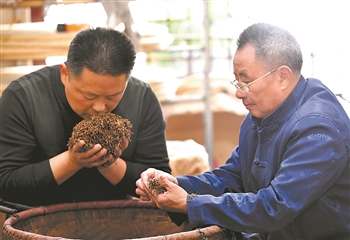 4月9日,制茶师梁骏德(右)与儿子梁添梦在察看发酵的茶叶。近日,在福建省武夷山市星村镇桐木村出产的金骏眉进入采摘制茶季。新华社记者 魏培全 摄