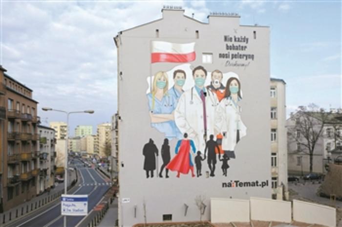 这是4月2日在波兰华沙拍摄的一座建筑外墙上以感谢医护人员为主题的壁画。上面写着“不是所有英雄都穿着披风,感谢你们”。新华社记者 周楠 摄