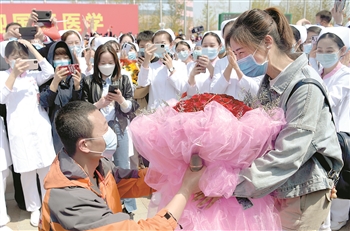 4月8日,西安国际医学中心医院援鄂护士赵宝宝向女友王瑶求婚。