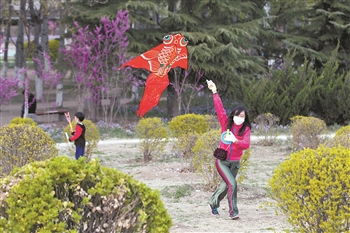 4月8日,在北京的一处公园内,阳光明媚、鲜花盛开,一名游客正在放风筝。北京市多家公园推出了全面加强公园限流管控和特殊时期综合服务措施。本报记者 王伟伟 摄