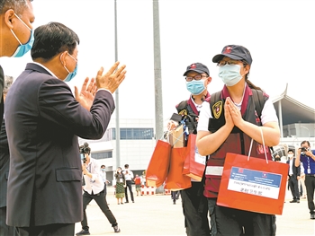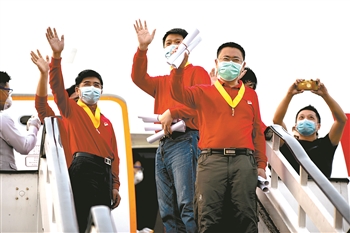 左图:4月11日,在委内瑞拉首都加拉加斯,中国抗疫医疗专家组在授勋仪式结束后登机回国。为了表彰专家组为委疫情防控所作突出贡献,委内瑞拉政府当天在机场向专家组全体成员授予“弗朗西斯科·德·米兰达”二级勋章。