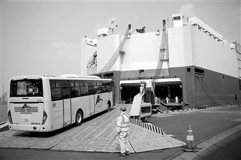 4月12日,大巴车在山东港口青岛港大港码头调度员的指挥下依次上船。当日,位于山东聊城的中通客车控股股份有限公司生产的320辆大巴车在这里启运,出口沙特。