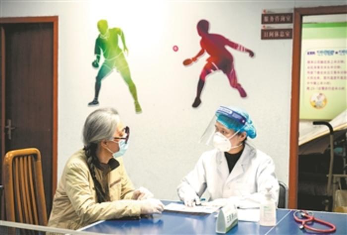4月14日,在武汉市江岸区花桥街花桥社区居家养老服务中心,武汉亚洲心脏病医院医护人员在为社区老人义诊。