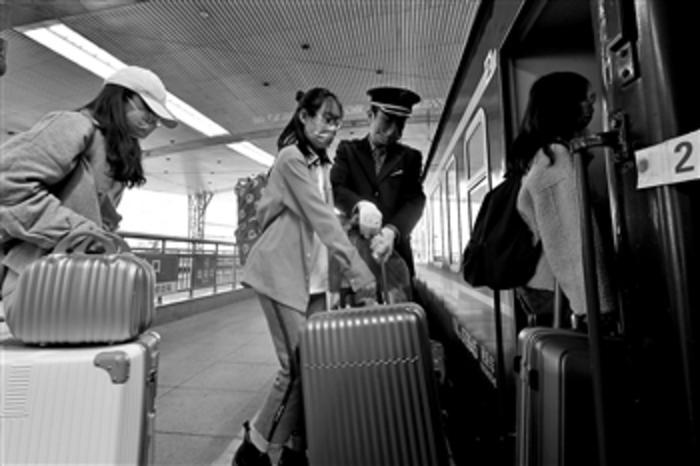 4月13日,在济南火车站,石河子大学学生登上K4046次列车。