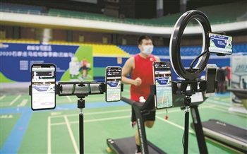 4月12日,在河北体育馆开幕式现场,健身教练通过直播设备线上带领网上参赛选手进行赛前热身。当日,2020石家庄马拉松春季赛(云端马)线上开幕式在河北体育馆举行。此次赛事于4月3日开启报名,持续到4月19日结束。疫情期间,比赛采用线上方式进行,参赛者使用任意可记录跑步数据的应用程序(APP)完成比赛,并上传成绩截图。 新华社发(张晓峰 摄)