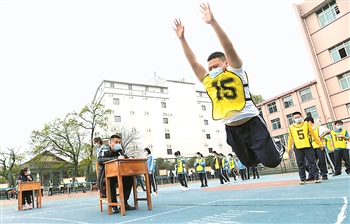 4月10日,贵州省贵阳市第十五中学初三年级的学生进行体育模拟测试。贵州省贵阳市初三、高三年级学生自3月16日返校复课以来,积极备战中考和高考。新华社发(赵松 摄)