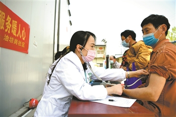 4月15日,医务志愿者在为复工的工人进行健康检查。