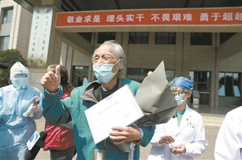 一个多月前,90后医生陪着年过八旬的新冠肺炎患者王欣一起看落日,温暖了无数国人。4月9日中午,87岁的王欣老人痊愈出院。背着心爱的小提琴,迈着轻快的步伐,王欣老人告别他入住了58天的病房,一路走到医院门口,享受正午的暖阳。(本报记者 张翀)