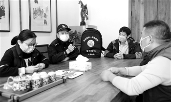 近年来,浙江绍兴市公安局上虞区分局章镇派出所持续推广“背包警务”,辖区民警背着背包上门服务,就像把警务室搬到了群众身边,为群众提供咨询和业务办理的便民小窗口。图为4月14日,民警在章镇镇一家企业为员工调解矛盾。 新华社记者 翁忻旸 摄