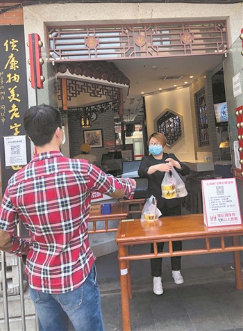 清晨6点,店门正式打开,各家外卖订单的提示音此起彼伏地响起,邓芹和同事将两张桌子抬到门口,留出一个人进出的通道,“方便店员进出递送商品和维持外面的秩序。”邓芹一边介绍一边将免洗消毒洗手液摆上了桌,一同上桌的还有香醋和辣椒油。随着邓芹的准备工作做完,外卖小哥们从不同的方向聚来,按照单号上前取单。7点一过,开始有附近无疫情小区居民和复工人员来到店前,耐心排队后,他们端起久违的热干面。