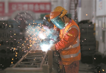 4月15日,在贵阳轨道交通3号线一期工程土建七标段项目部钢构件加工厂,一名工人在加工格栅拱架。连日来,贵阳轨道交通3号线的3400余名建设者加班加点,全力奋战在施工一线。 新华社发(张晖 摄)