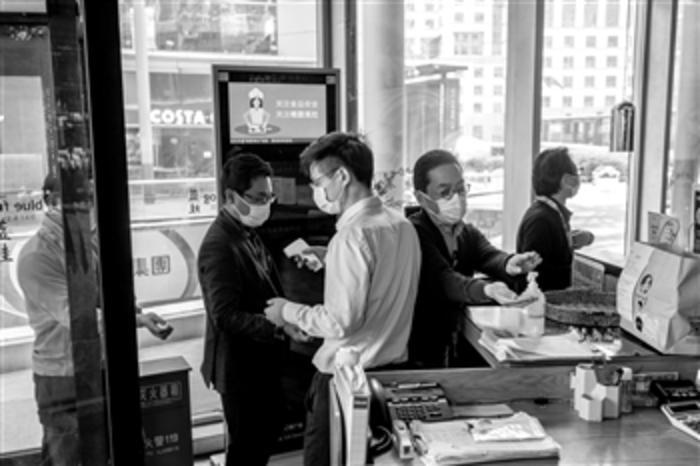 图为北京一家西餐厅内,门店服务员李朋正在为入店就餐的顾客测量体温。据了解,该餐厅在疫情期间,调整经营模式,推出多种套餐和线上外卖,以减少疫情带来的经济损失。