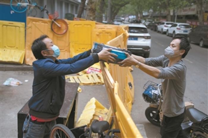 图为4月16日,市民将需要寄出的包裹交给快递员(右)。