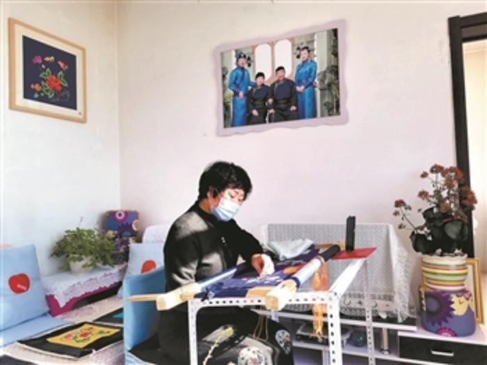 图为内蒙古兴安盟科尔沁右翼中旗绣娘王金莲在家通过手机视频教授蒙古族刺绣(2020年2月27日摄)。
