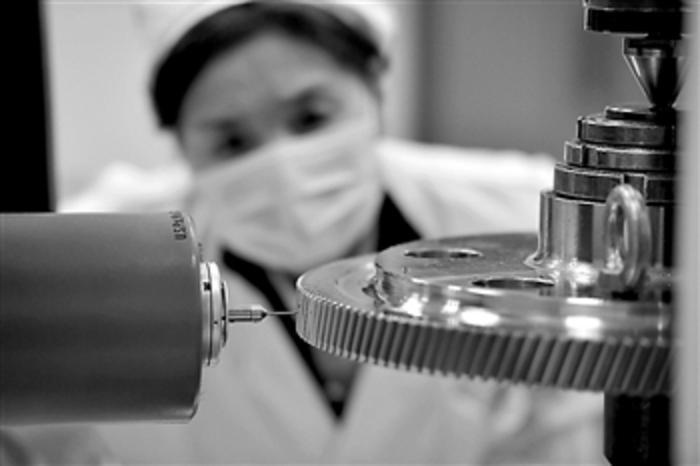 4月14日,在该公司总装车间内,技术人员在使用测量仪器检验经过机床加工的齿轮精度,确保机床性能达标。