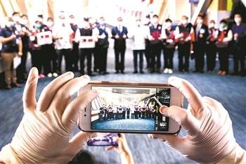 ①4月19日,在菲律宾马尼拉机场,中国援菲律宾抗疫医疗专家组成员在回国前合影留念。中国援菲律宾抗疫医疗专家组19日结束在菲为期两周工作,乘机回国。新华社 发(乌马利 摄)