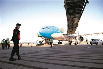 ③4月17日,在阿根廷布宜诺斯艾利斯埃塞萨国际机场,一架包机准备前往中国上海运载防疫物资。新华社发(马丁·萨巴拉摄)