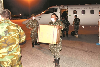 ②4月18日,在北马其顿首都斯科普里国际机场,北马军人从一架飞机上卸载中国援助的抗疫物资。新华社发