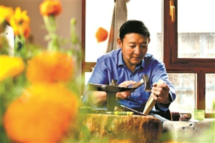 图为青海省玉树藏族自治州玉树市的藏刀匠人更求彭措在制作藏刀刀鞘。