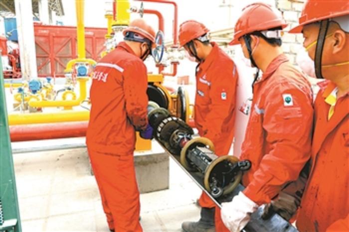 图为4月16日,职工在塔河油田至新疆轮台县天然气管道清管作业中,放入检测器,运用管道内检测技术开展管道内腐蚀、裂痕、变形等损伤情况检测。