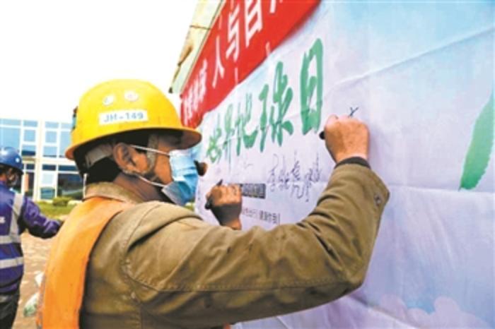 在第51个世界地球日到来之际,中建三局二公司北京公司太原潇河大桥项目管理人员携手30余名工友,践行“水滴计划”中的“每日环保”理念,开展“珍爱地球,人与自然和谐共生”宣传活动。图为工友在环保签名板前签名。张领 摄