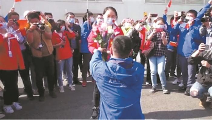 4月15日,雷神山医院休舱日当天,中南医院重症医学科护士胡志敏向同科护士曾盈盈爱的告白,得到现场工作人员的祝福。(本报记者 张翀)