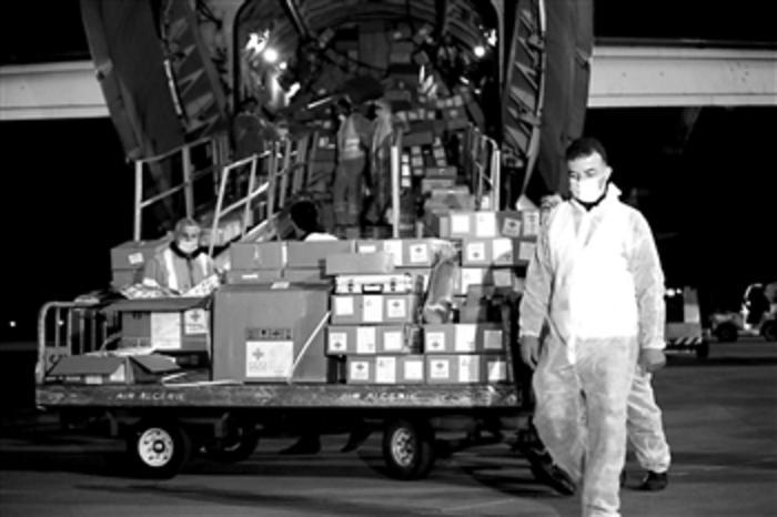中国援助阿尔及利亚的新一批医疗物资21日晚运抵阿尔及尔国际机场。新华社发