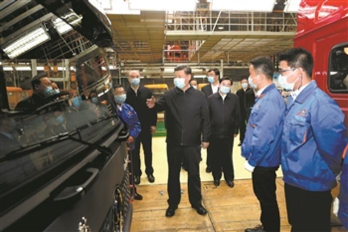 4月22日,习近平在陕西汽车控股集团有限公司察看生产线,了解产品研发、生产、销售和复工复产情况。新华社记者 鞠鹏 摄