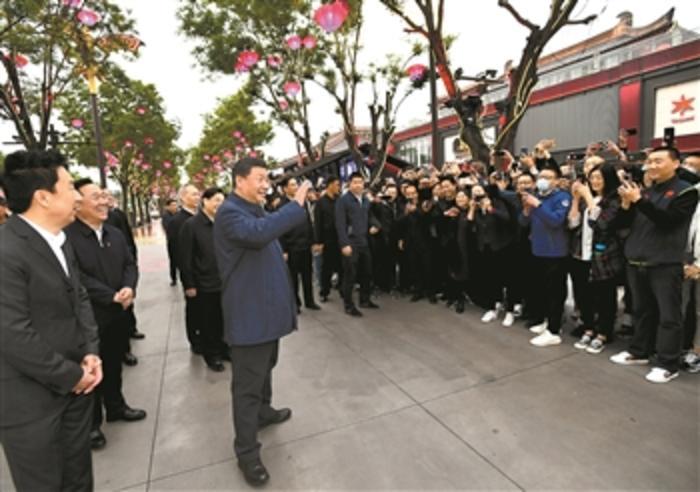 4月22日,习近平在西安大唐不夜城步行街考察时,向游客挥手致意。 新华社记者 谢环驰 摄