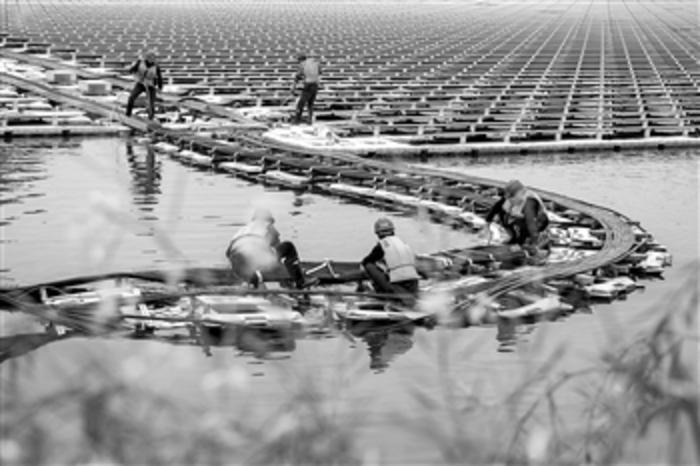 据介绍,该渔光互补光伏电站工程由中国能建浙江火电承建,共安装光伏组件近28万块,装机容量100兆瓦,水域面积约2200亩,水域岸线长约8公里,是目前国内漂浮物最长的渔光互补光伏发电项目。