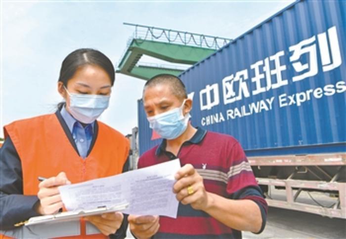 4月25日,中国铁路南昌局集团有限公司海沧站货运员李莹(左)在厦门海沧站和发货方代表办理中欧班列货物进站交接手续。