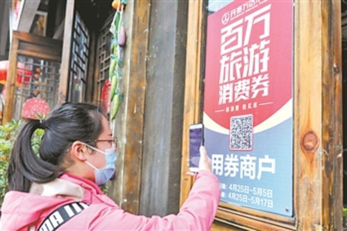 4月25日,游客在丹寨万达小镇扫码领取旅游消费券。