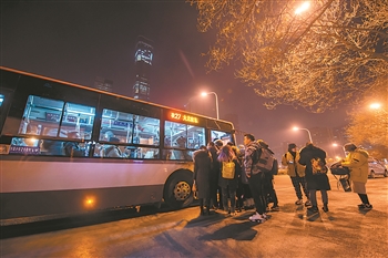随着乘客刷卡的“滴滴”声,几张熟悉的面孔出现在王利艳眼前。上车的是几个常坐夜27路回家的年轻人,他们似乎并无倦意,饶有兴致地聊起了天。