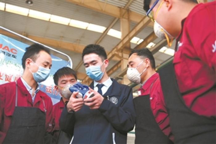 4月27日,常青街道凌大塘社区邀请专业人员到辖区企业车间为工人讲解防护设备的使用方法。当日,安徽省合肥市包河区常青街道开展健康讲座、职业病防护宣传等系列活动,提高劳动者的自我防护意识和能力,迎接“五一”国际劳动节。 新华社记者 刘军喜 摄