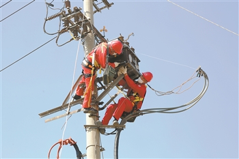 图为两名工人正在线杆上加装占位器。杨军 张猛 摄