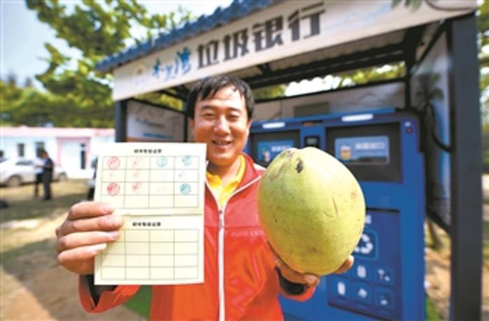 4月28日,文昌市木兰湾的工作人员展示“垃圾存折”,60积分可兑换一个椰子。