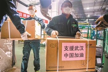 2月6日,北京邮区中心局,工作人员在搬运支援武汉的防疫物资。