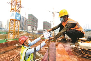 4月30日,工作人员(左)向工人送上“防疫健康包”。