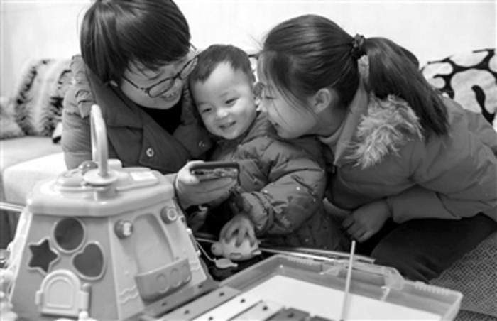 李玲和孩子们正在与远在海上的丈夫视频通话。受访者供图