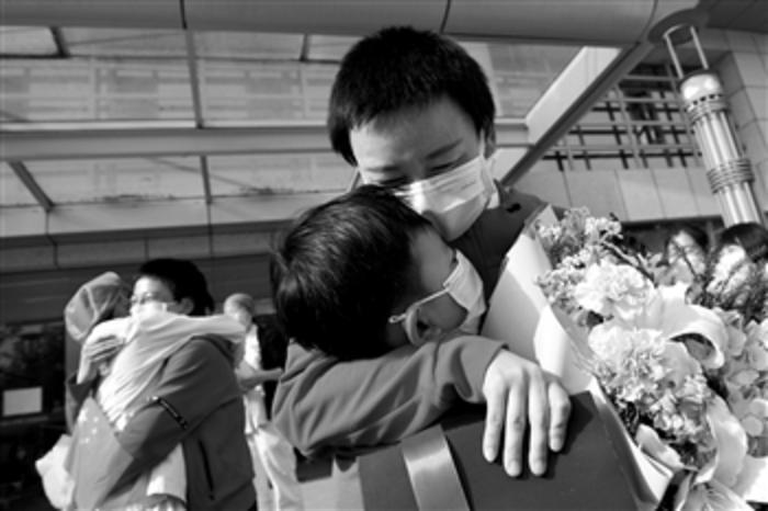 4月15日,西安交通大学第二附属医院援鄂国家医疗队一名女队员与前来迎接的儿子拥抱。 新华社记者 李一博 摄