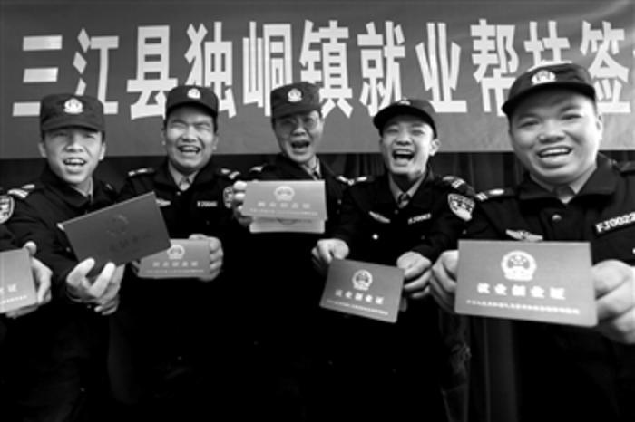4月27日,隔离观察期一结束,广西籍辅警就拿到了就业创业证。这正是江苏南京港出入境边防检查站对广西三江县独峒镇具盘村的一项扶贫举措——就业扶贫。