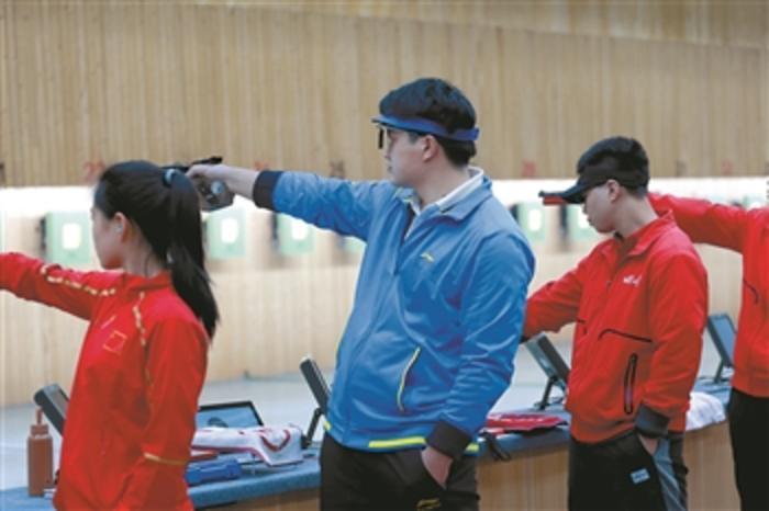 4月29日,在四川省陆上运动学校,四川队选手雷琪(中)在10米气手枪比赛中。 当日,“2020年西南射击网络赛(10米气枪项目)”同时在重庆、四川、贵州、云南四地省级训练基地鸣枪开赛。四省市的90名运动员分别在自己的场馆、通过网络平台隔空竞技,决出西南“神枪手”。 新华社发(陆校摄)