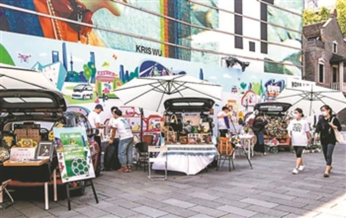 5月7日,10辆迷你智能汽车停泊在上海新天地的南里广场上,变身移动商铺。花卉、首饰、理发等各种服务吸引了众多游客、市民驻足。