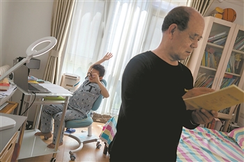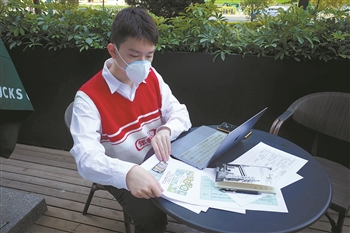 4月23日,北京一小区内,上三年级的王胤明正在上网课。从4月13日开始,北京市教委按照高中、初中、小学各年级的顺序,分批次上线学科课程资源。