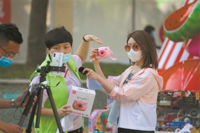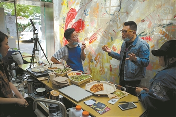 4月11日,北京市朝阳区蓝色港湾商区,主播正在介绍促销的商品,带领观众“云逛街”。