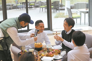 4月11日下午,北京丽晶酒店大堂内,故宫“小哥”付坤(右二)为网友介绍品尝“新一代晶彩晶味故宫以东下午茶”。