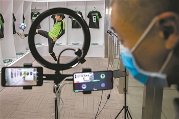 4月22日晚,北京爱踢客青少年足球俱乐部内,教练员施达正通过直播平台为居家的小球员们上课。