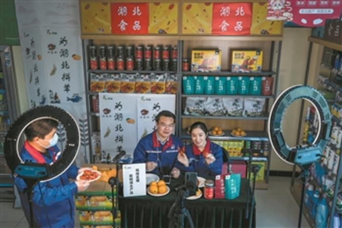 4月27日下午,在北京望京新城加油站的便利店内,来自中国石化北京石油的员工史筱洁和张风变身主播,正为网友们介绍来自湖北的各类特产,帮助湖北商户促销受疫情影响而滞销的产品。春茶、小龙虾、伦晚脐橙……面对网友各式各样的提问和要求,这对新搭档都会耐心解答。第一次做主播的史筱洁坦言,“面对镜头时小心脏还是会怦怦乱跳的。”当天,不到两个小时的直播,他们就创造了13.1万元的销售额。